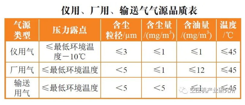電廠壓縮空氣的品質,根據GB/T 4830-2015《工業自動化儀表 氣源壓力范圍和質量》、Q/DG1-J0110-2011《火力發電廠儀用、廠用壓縮空氣系統設計技術導則》以及《電力工程設計手冊-火力發電廠除灰設計》中相關規定,各氣源應符合下表的規定。